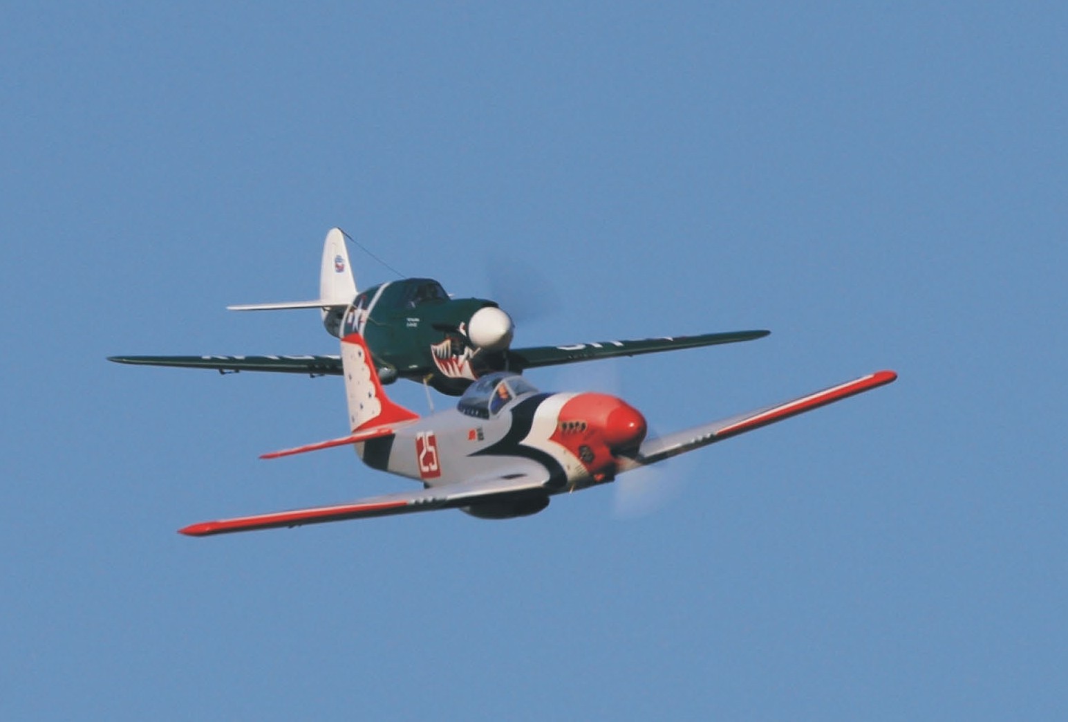 (Pic by Ross Felix - Richard Mudge P-51 Mustang leads the P-40 flown by Chris Carpenter into the dive to the Adelaide start line)